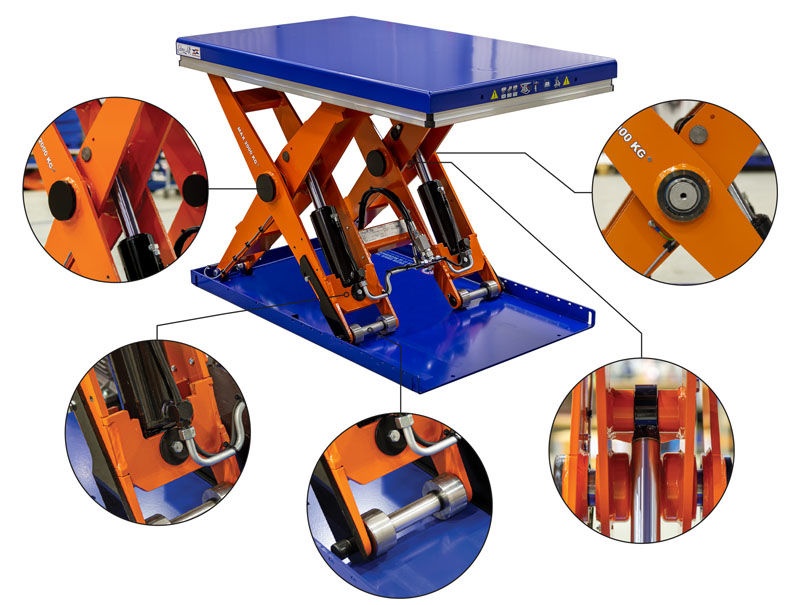 Standardimuodossaan Edmolift HD-sarjan pöydät ovat rakennettu vakaiksi kaksinkertaisilla litteillä teräsleikkureilla, ulkoisella hydrauliyksiköllä, vaikuttavalla minimikorkeudella ja 2 tonnin nostokyvyllä.