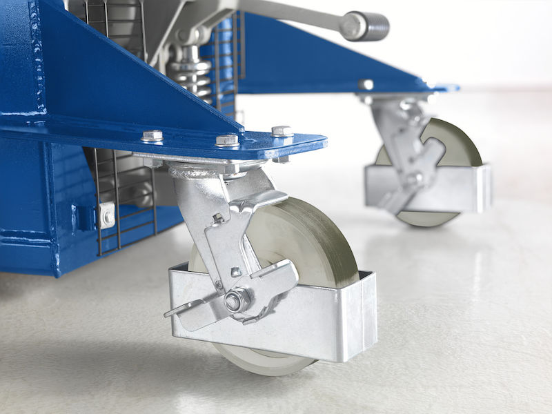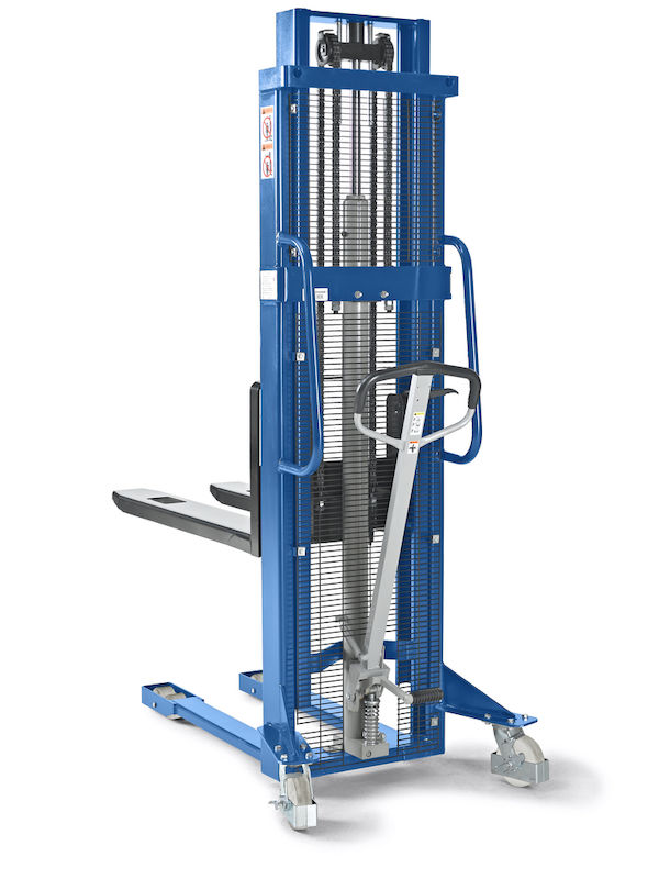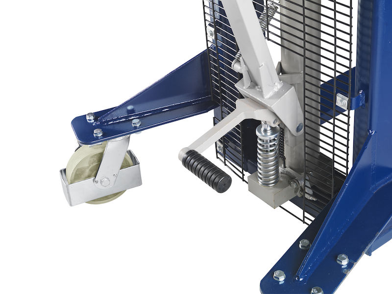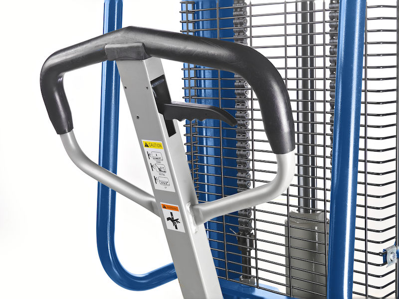 Tukevan rakenteen, vahvistetun mastoprofiilin ja kromatun hydraulimännän ansiosta tämä korkean nostokorkeuden pinoamisvaunu on erittäin kestävä ja luotettava. Kuormaketjut ja nostosylinterit on suojattu suojaritilällä, joka suojaa putoavilta esineiltä ja mahdollistaa vapaan näkyvyyden ajosuuntaan. Suurikokoisista työntökahvoista saa hyvän otteen, mikä parantaa ajomukavuutta. Kääntöpyörien jarrut pitävät vaunun tukevasti paikallaan.
