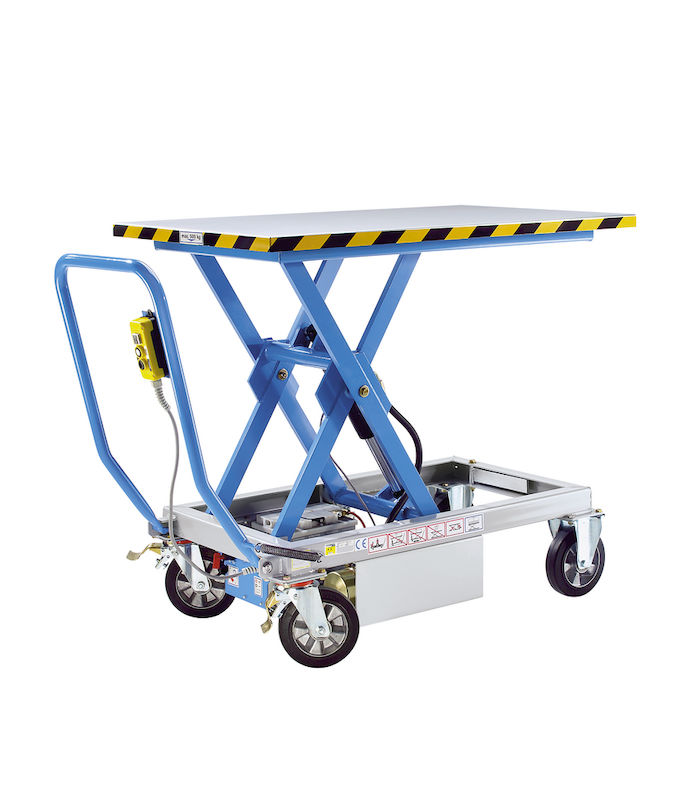 Pinoamisvaunu Kira, sähköhydraulinen nosto, nostokyky 1000 kg, umpirenkaat. Sähkökäyttöinen Nostovaunu hydraulisen nostosylinterin (bioöljy) avulla. Työntöaisa sisältyy toimitukseen.