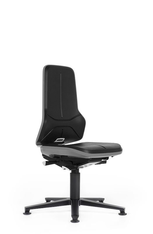 Synkromekanismilla ja ergonomiapaketilla varustettu teollisuustuoli. Kaasujousitoiminen korkeussäätö välillä 450–620 mm. Pyörillä varustettu alumiininen jalkaristikko, musta. Jalan halkaisija 700 mm. Istuinosan kaltevuuden säätö 0°–+9°.