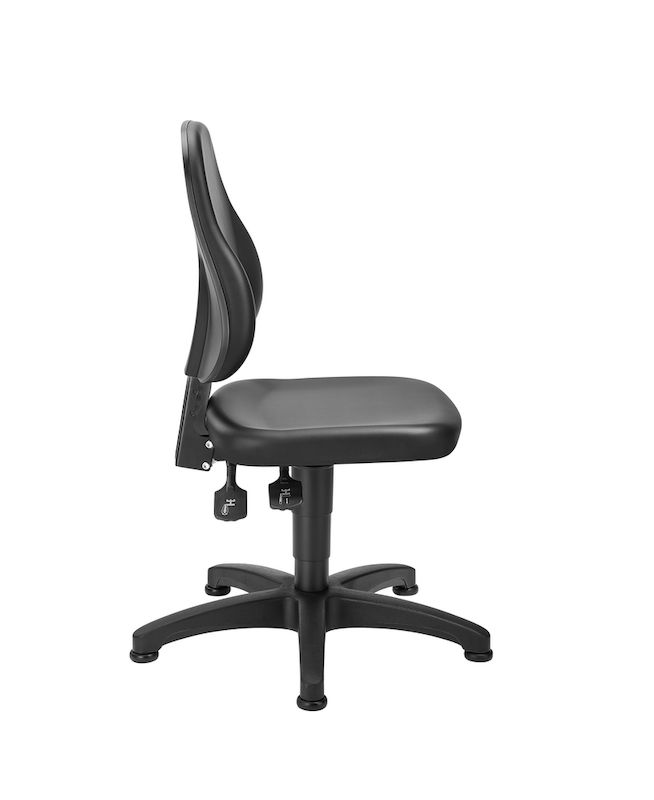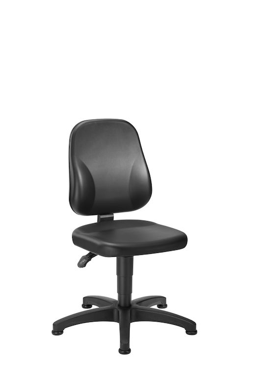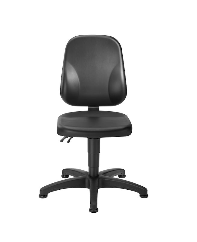 Teollisuustuoli Elinor, liukujalat, 440–620 mm. Mustat keinonahkapehmusteet ovat pehmeät ja helppohoitoiset, ja ne on helppo puhdistaa ja kestävät desinfiointiaineita. EUROKRAFT-basic tuolissa on ergonomisesti muotoiltu istuinosa lantiotuella ja iso, ergonomisesti muotoiltu selkänoja integroidulla ristiseläntuella. Näin tuoli tukee istujaa optimaalisesti.