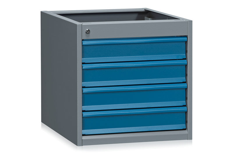 Pöytälaatikosto Mist, LxSxK 535x670x540, 4 laatikkoa. Pöytälaatikosto Mist vahvalla rakenteella. Harmaalakattu teräspelti RAL 7037. Laatikossa on kuulalaakerit ja se on 100 % ulosvedettävä. Laatikoston vedin on teivutettua peltiä. Keskuslukitus. Max kuormitus 45 kg. Avoin pääliosa. Asennetaan suoraan työtason alapintaan (40 mm).