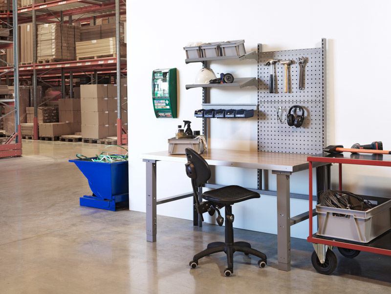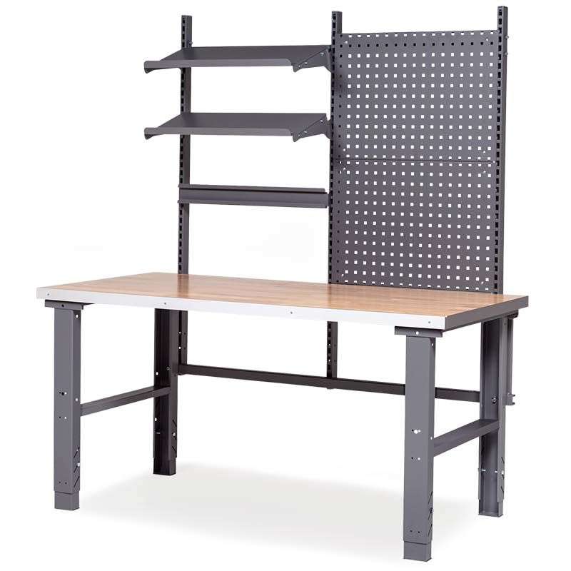 Paketti: Työpöytä teollisuuteen Tor, harmaa, HPL-laminaatti 40 mm. Manuaalisesti korkeussäädettävä välillä 740-1000 mm (ilman pöytälevyä). Valmis työpiste jossa pöytälevy ja seuraavanlaiset lisäosat. Tukeva ja kestävä, 40 mm tammiparkettilevy, juonka etuosan reunalista on alumiinia. Päällysrakennerunko, 3 pilaria, 2 vakautustukea c/c 670 mm, 2 hyllytasoa c/c 670 mm (syvyys 300 mm), 2 työkalutaulua c/c 670 mm (666x480 mm) ja takareunus c/c 670 mm.