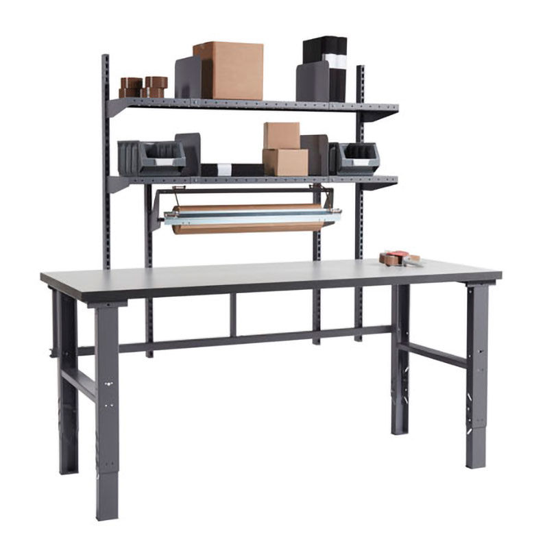 Pakkaustyöpöytä Tor, 500 kg, 1600x800 mm. Manuaalisesti säädettävä korkeus 740-1000 mm (ilman tasoa). Sisältää tukevan ja kestävän harmaan 40 mm paksun laminaattilevyn ja seuraavanlaisen lisärakenteen työtason päälle: Lisärakenteen 2:lla pilarilla, 2:lla hyllytasolla c/c 1400 mm sis. 6 kpl jakajaa, rullapidike c/c 1400 mm ja leikkuri c/c 1400 mm (leikkausleveydellä max 1350 mm).