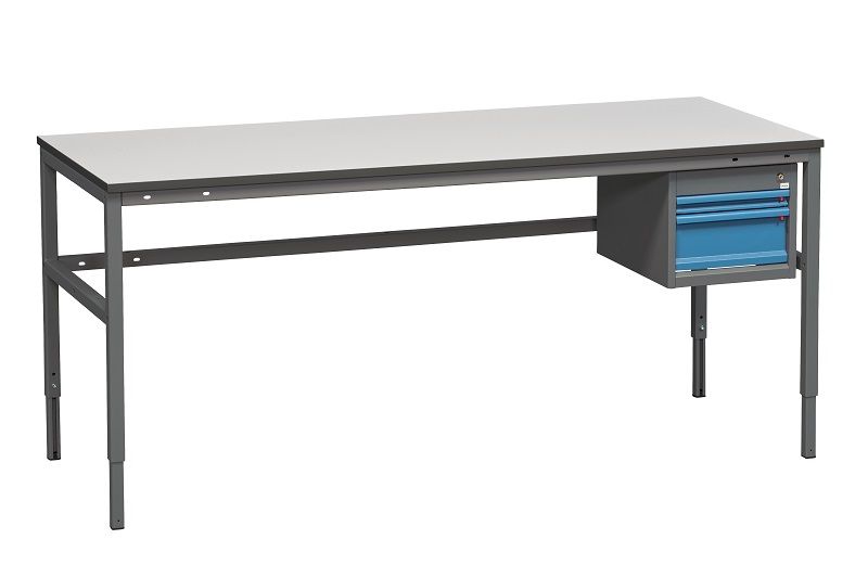 Työpöytä Embla, jossa 2 laatikon laatikosto, 1200x800 mm. Harmaa laminaatti. Täydellinen työpöytä, jossa on 2 laatikon säilytyslaatikosto, 325x385x500 mm. Vahvat profiiliputket, 40x40 mm, harmaa jauhemaalaus, tekevät rakenteesta erittäin tukevan. H-päädyt on yhdistetty kolmella vakauttavalla poikittaistuella. 24 mm:n paksuiset pöytälevyt ovat vaaleanharmaata korkeapainelaminaattia tai liimattua harmaata vinyyliä. Kaikissa pöytälevyissä on grafiitinharmaat reunalistat.