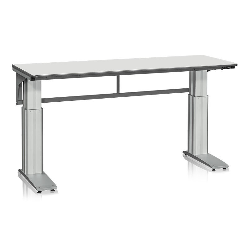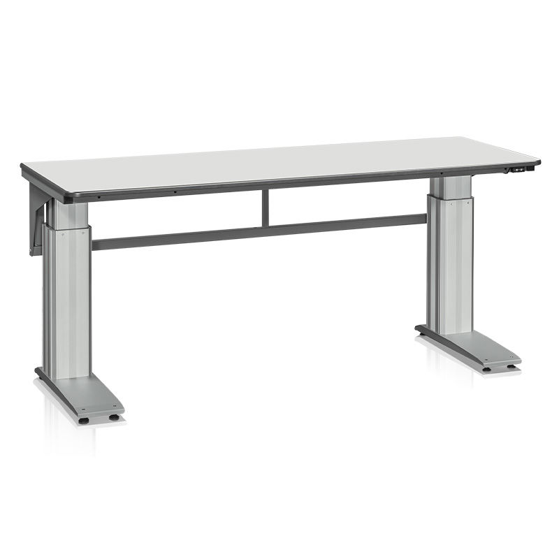 Huge sähkösäädettävä pöydänrunko on alumiinia ja viimeistelty kestävällä pulverilakkauksella. Pöytälevy on harmaata laminaattia, joka on 24 mm paksu. Vankka ja hiljainen korkeudensäätö käy helposti ylös-alas napilla. Korkeudensäätöväli 650-1100 mm. Nostokyky 500 kg.