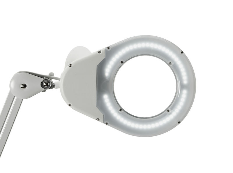 Suurennuslasivalaisin Vilda, varren pituus 310 mm, jalusta, valkoinen. Tukeva ja vahva, 360° käännettävä metallivarsi. Lampun pää PxL 265 x 200 mm, 56 LED-valoa, värilämpötila 6500 kelviniä, valon voimakkuus 2120 luksia 350 mm:n etäisyydellä, valovirta 935 lumenia.