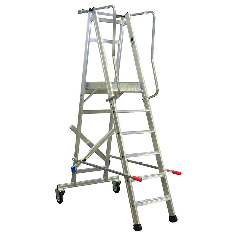 Pyörälliset tasotikkaat 1500 mm, 6 askelmaa. Siirrettävät tasotikkaat on varustettu pyörillä, suojareunuksella ja tukevalla tasolla. Kevyet ja tukevat alumiinitikkaat, jotka voi tarvittaessa taittaa kokoon. Eurooppalaisen ja ruotsalaisen EN131-7-standardin mukaisesti hyväksytyt siirrettävät tasotikkaat.