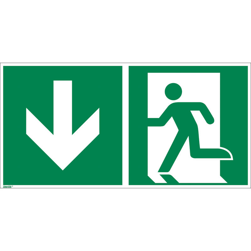 Hätäpoistumistie kyltti, jälkivalaiseva, alas, 400x200 mm, alumiini, 10-pakk. Käytännöllinen poistumistieopaste moneen käyttöön. Kyltit ovat valmistettu alumiinista tai muovista. Valmistus ISO 7010/ASR A3.3. mukaisesti. Sijoitetaan näkyvälle paikalle voimassa olevien säännösten mukaisesti. Saatavilla kaksi- ja yksipuoleisena. Opasteen luminanssi on 55 mcd/m2, 2 kertaa kirkkaampi kuin DIN-norm 67510 vaatimus. UV-suojattu. Voidaan käyttää sekä sisä- että ulkotiloissa. Loistaa pimeässä latauduttuaan päivänvalosta, LED-valosta tai toisesta valonlähteestä.