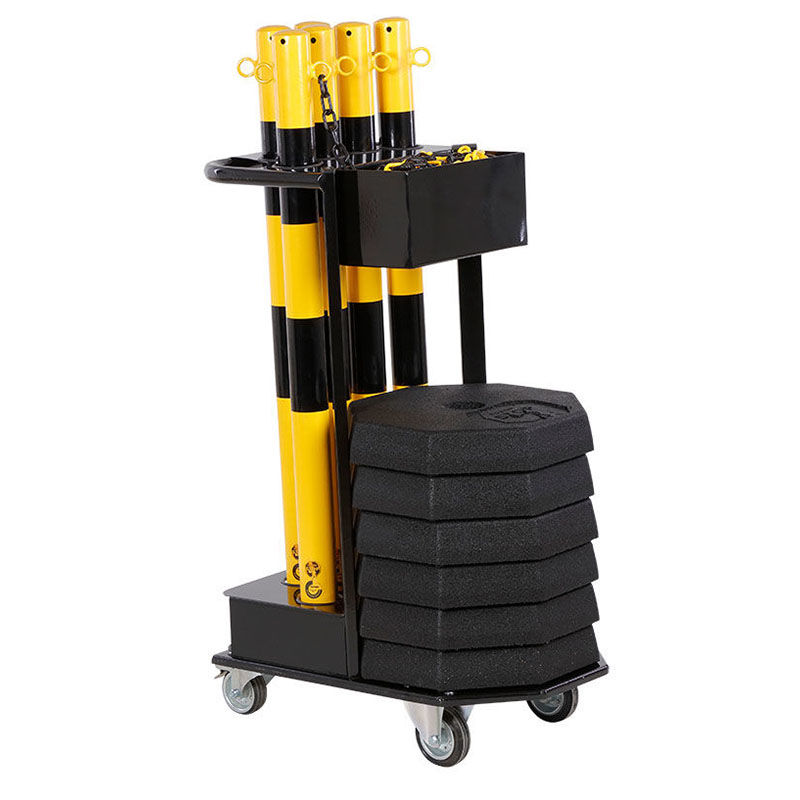 Kätevä vaunu, 6 terästolppaa, jalat ja laatikko, jossa on tilaa pakettiin sisältyvälle 25-metriselle polyuretaanista valmistetulle rajausketjulle. Saatavilla kaksi väriä: punainen/valkoinen ja musta/keltainen.