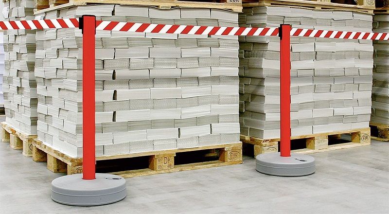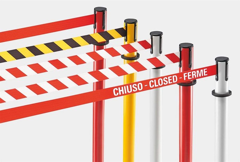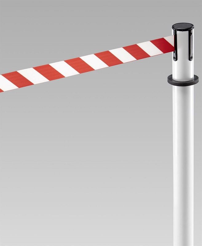 Ulosvedettävä tekstiilinauha, 4-suuntainen järjestelmä, tolpan väri valkoinen, nauhan väri punainen / valkoinen