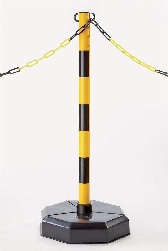 Rajaustolppa, muoviputkitolpat, muovijalka betonitäytteellä, tolppa keltainen / musta. Sisä- ja ulkokäyttöön Kahdeksankulmainen jalkarakenne lisää vakautta Punavalkoiset tai keltamustat pylväät näkyvät hyvin. Muovipylväät 2 ketjukoukulla. Jalka mustaa muovia, betonitäytteellä tai ilman. Tyhjän jalan voi täyttää hiekalla tai kivillä.
