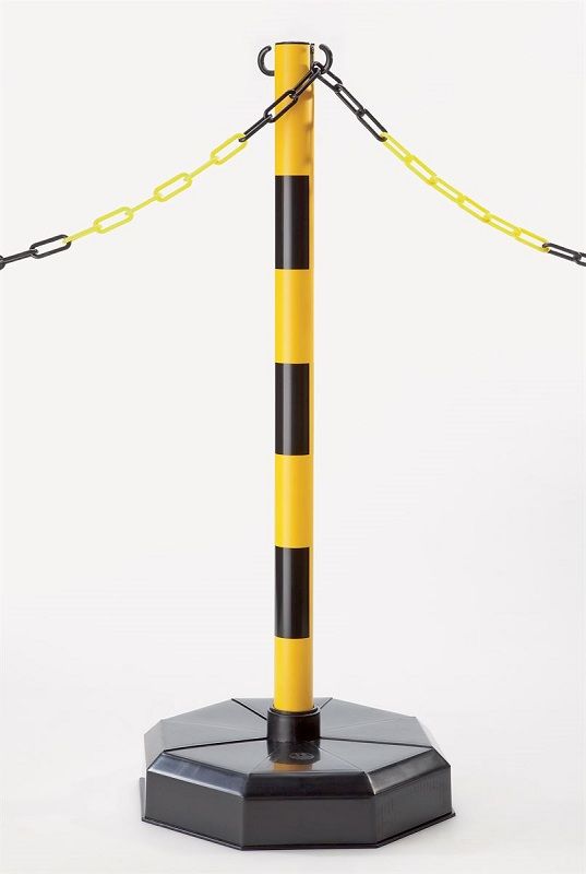 Rajaustolppa, muoviputkitolpat, muovijalka ilman betonitäytettä, tolppa keltainen / musta. Sisä- ja ulkokäyttöön Kahdeksankulmainen jalkarakenne lisää vakautta Punavalkoiset tai keltamustat pylväät näkyvät hyvin. Muovipylväät 2 ketjukoukulla. Jalka mustaa muovia, betonitäytteellä tai ilman. Tyhjän jalan voi täyttää hiekalla tai kivillä.