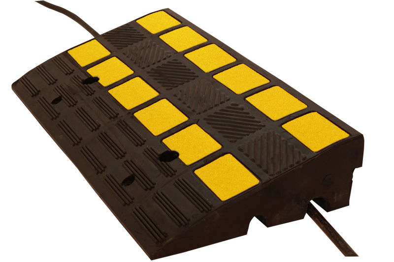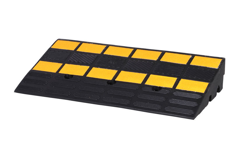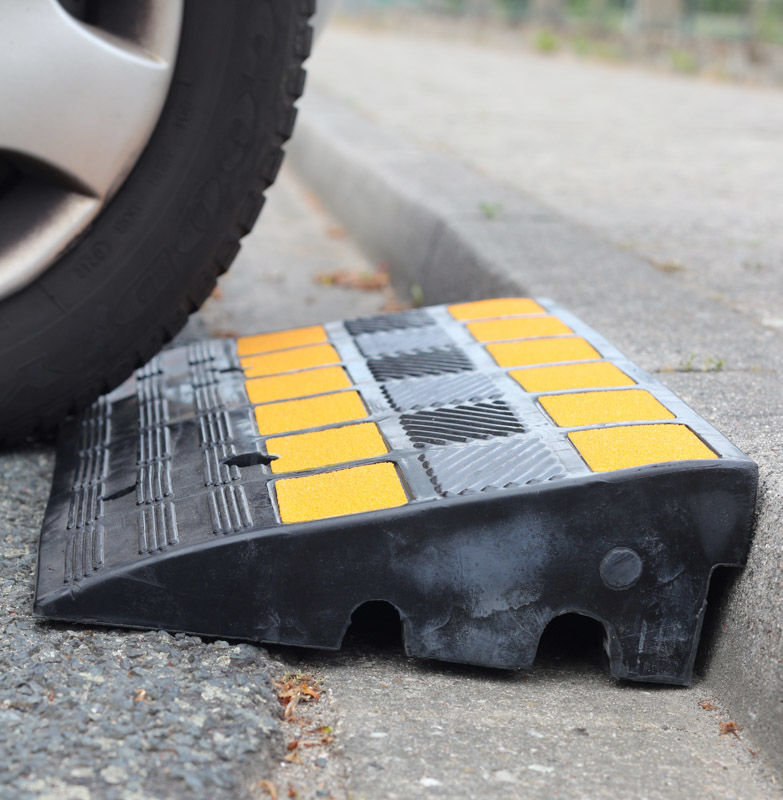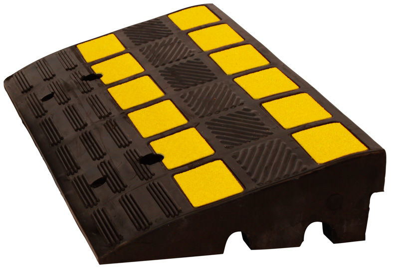 Ajoramppi Veman, kaapelikanavilla, PxLxK 600x300x100mm, musta/keltainen. Toimii sekä ajoramppina että kaapelikanavana. Rampin muoto helpottaa ylittämään 100-150 mm korkeita reunakivetyksiä tai tiekorotuksia. Rampissa on liukueste ja kuvioitu pinta, joten auton pyörien ja kumisen rampin välille muodostuu pitävä kitka. Ajoramppi näkyy hyvin keltaisten heijastavien merkkien ansiosta. Valmistettu läpivärjätystä, uudesta kumista ja on erittäin pitkäikäinen ja kestävä. Rampin alapuolella olevat kanavat päästävät sadeveden valumaan läpi. Niitä voi myös käyttää johtojen ja kaapeleiden suojana ja läpivientikanavina. Kanavien mitat: ø30 mm ja ø25 mm. Ajoramppi kestää myös kuorma-autolla ajon. Enimmäiskantavuus 40 t. Valmius pysyvää kiinnitystä varten (3 porareikää).