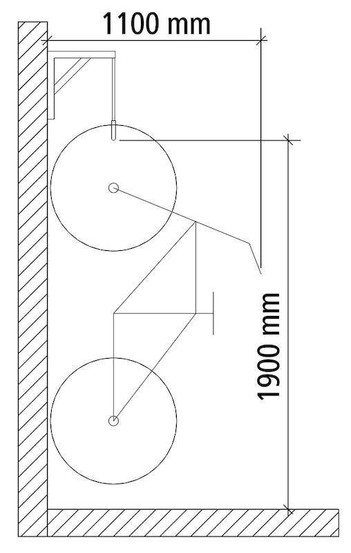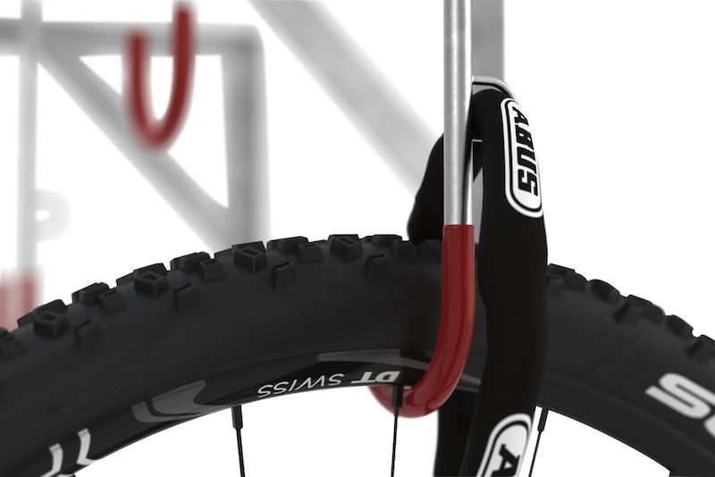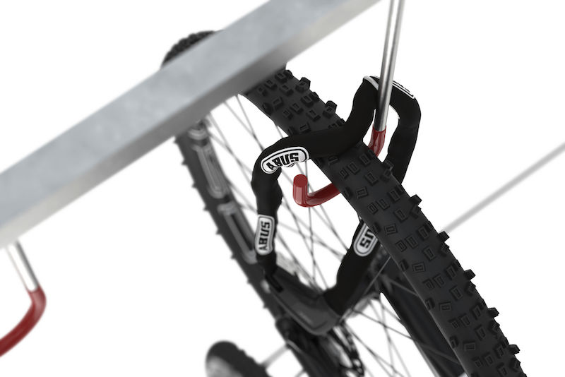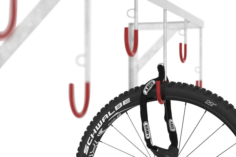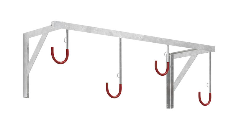 Polkupyörän koukkuteline Carsten. 4-paikkaisessa polkupyörän koukkutelineessä on profiiliteräksestä valmistettu kiinnityskisko ja seinäkonsolit. Materiaali on myös kuumasinkitty. Koukut ovat valmistettu pyöröteräksestä, ja niissä on vanteita suojaava muovipäällyste. Koukkujen pituus min./maks.: 200/350 mm.