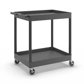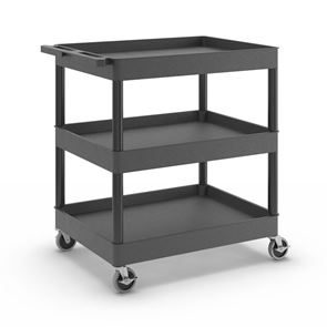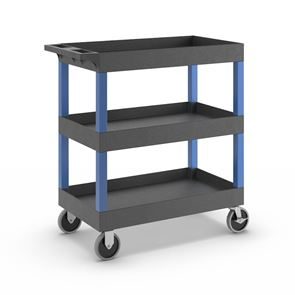 Hyllyvaunu Jussi, PxLxK 895 x 460 x 950 mm, 3 hyllyä, 3 allasta, musta/sininen. Valmistettu kokonaan kierrätettävästä polyeteenistä.