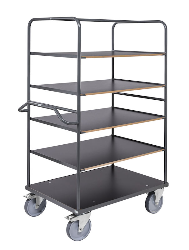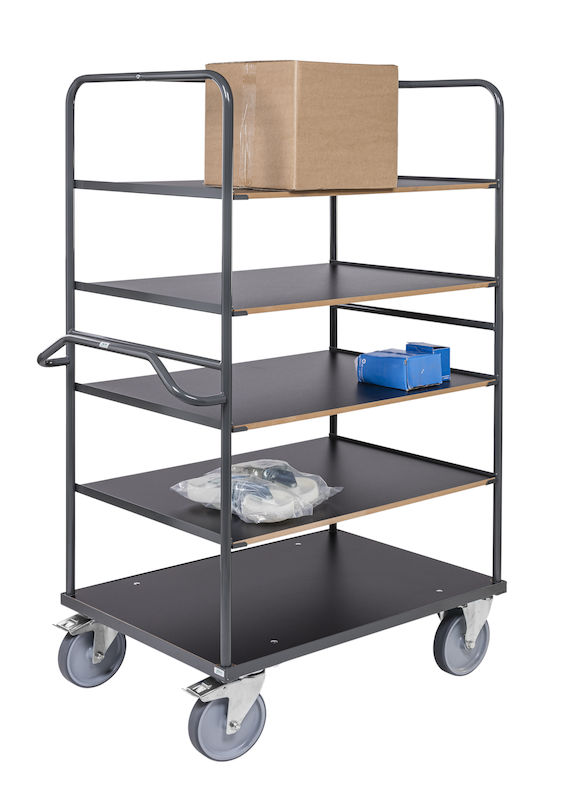 Hyllyvaunu Nean, PxLxK 1300x800x1800 mm, jarrulla, harmaa. Kestävä hyllyvaunu jossa on 5 laminaattihyllyä ja harmaa jauhemaalattu teräsrakenne. Vaunussa on 2 kiintopyörää ja 2 kääntöpyörää jarrulla, halkaisija 200 mm. Ensimmäinen hyllytaso on 300 mm korkeudella. Hyllytasojen välit ovat 300 mm korkeat. Kantavuus 100 kg / hyllytaso. Hyllytason pituus 1125 mm ja leveys 772 mm. Korkeus kahvaan 1040 mm.
