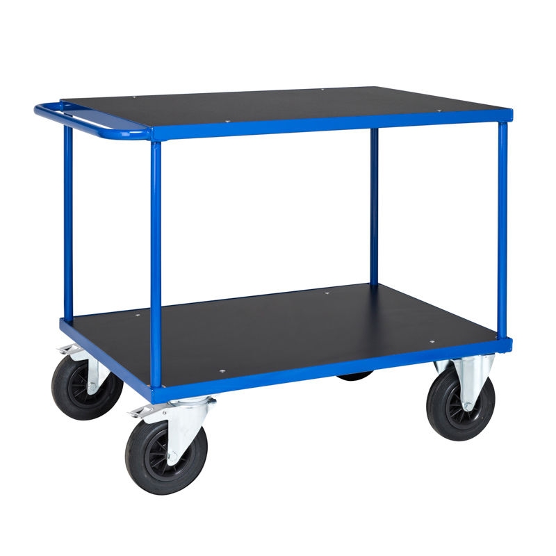 Tasovaunu Geran, PxLxK 1000x600x890 mm, jarrulla, sininen. Teollisuuteen sopiva vaunu vahvalla teräskehyksellä ja laminaattitasoilla. Vaihtoehtoina siniseksi jauhemaalattu teräskehys tai kehys sinkittyä terästä. Kantavuus 250 kg/hyllytaso (tasaisesti jakautunut paino). 2 kiinteää ja 2 kääntyvää kumipyörää Ø 200 mm, jarrulla tai ilman. Korkeus ensimmäiseen hyllytasoon 240 mm ja hyllytasojen väli on 580 mm korkea.