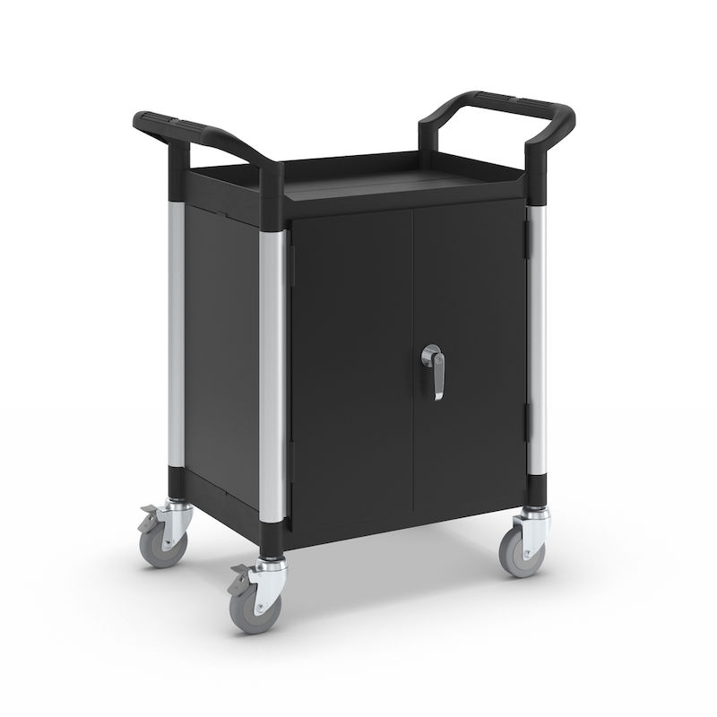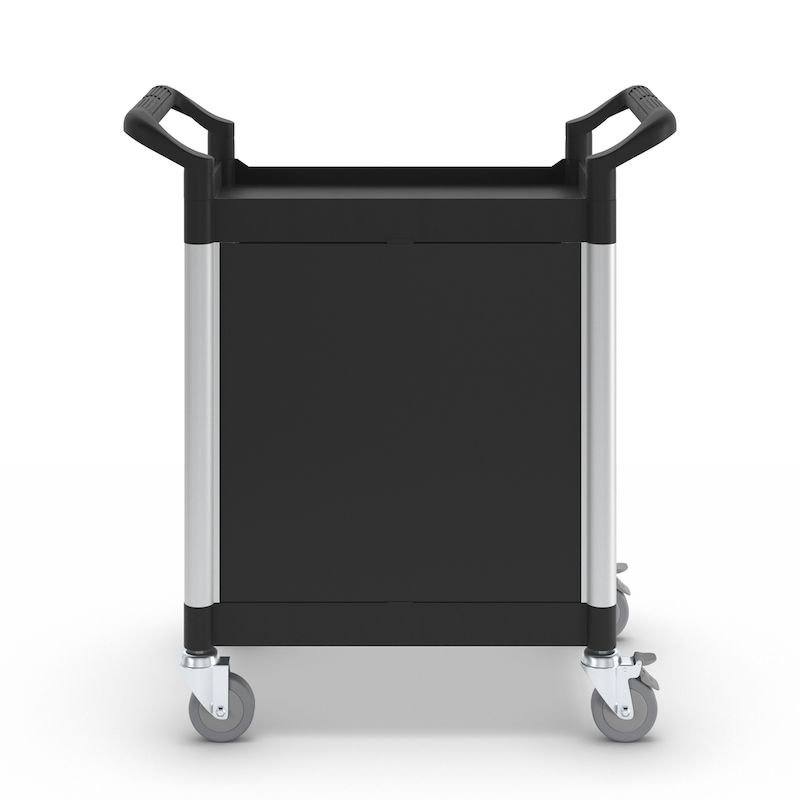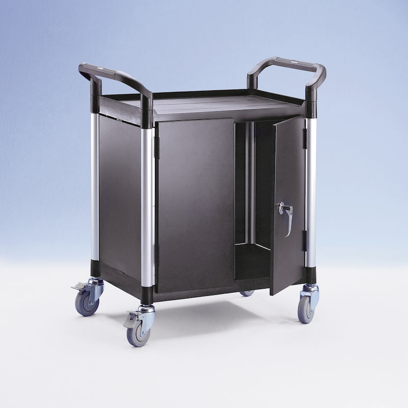 Tasovaunu Pelle, 2 sivuseinää, 1 takaseinä, pariovet, 2 hyllytasoa, PxLxK 850 x 480 x 950 mm. Hyllytasot ja työntökahvat muovia. Vahvistetut yhdysputket alumiinia. Tukevat seinät metallia.