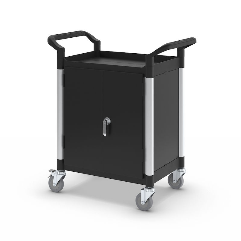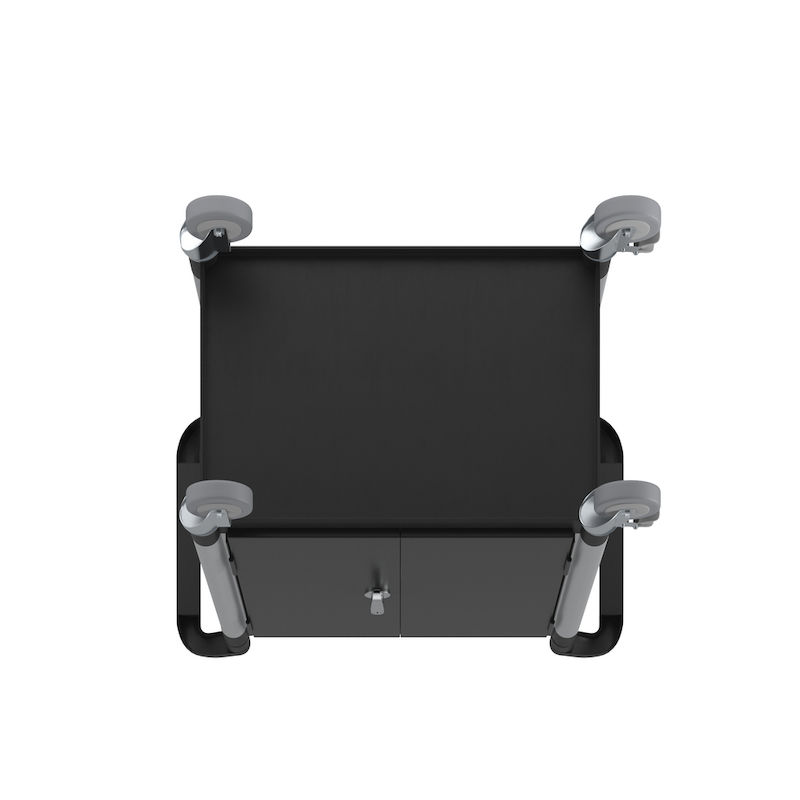 4 kuulalaakeroitua kääntöpyörää, joista kahdessa kaksoisjarru. Pyörän Ø 100 mm, non-marking-umpikumipyörät.