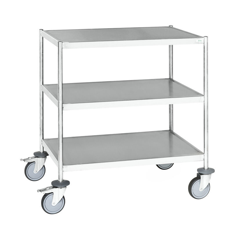 Tarjoiluvaunu, ruostumaton, 3 tasoa, PxL 800x550 mm, max 200 kg, täyshitsattu. Tarjoiluvaunun runko ja hyllytasot ovat ruostumatonta terästä. Tasoissa on vettähylkivä matto alapuolella, joissa on täyttöreuna ympärillä. Tulee käytön jälkeen pyyhkiä täysin kuivaksi!