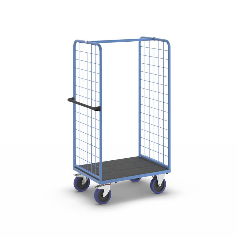 2 kääntöpyörää ja 2 kiintopyörää, täyselastiset renkaat ja rullalaakeroidut muovivanteet. Kääntyvissä pyörissä kaksoisjarru.