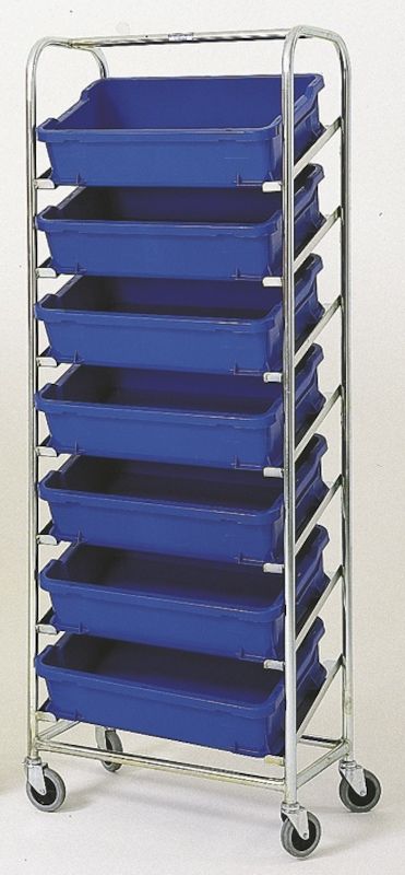 Laatikkovaunu Garm, sinisillä laatikoilla. Laatikkovaunussa vinot kiskot ja tilaa 7:lle laatikoille, joiden koko on 600 x 400 x 145 mm. Laatikkotelineen voi tilata laatikoilla tai ilman laatikoita. Etäisyys kiskojen välillä 195 mm. Vaunussa on 4 kpl kääntöpöyrää, joiden halkaisija on 100 mm. Enimmäiskuormitus 150 kg. Vaunun mitat: L 660 x S 410 mm x K 1850 mm. Toimitetaan osissa kasaamattomana.