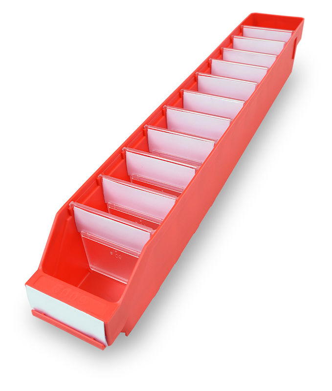 Ottolaatikko Stemo, 600x90x95 mm, 40-pakk, punainen. Fiksu hyllylaatikko erilasiin laatikkohyllyihin. Useita syvyyksiä ja useita värivaihtoehtoja. Ottolaatikko on valmistettu kierrätettävästä polypropeenista.
