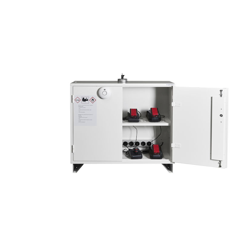 Paloeristetty akkukaappi litiumakkujen turvalliseen säilytykseen ja lataamiseen. Minimoitu palo- ja räjähdysvaara.