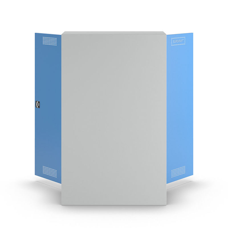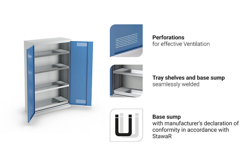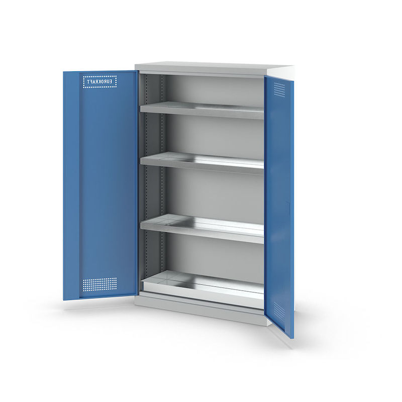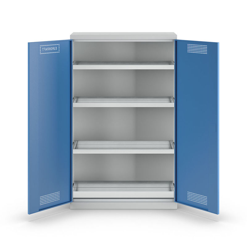 Kemikaalikaappi Stig, 1 pohja-allas ja 3 valuma-allasta, leveys 1200 mm. eurokraft pro-sarjan kemikaalikaapit mahdollistaa kemikaalien turvallisen varastoinnin. Tukeva, laadukas metallikaappi on valmistettu vahvistetusta teräspellistä. Viimeistelty jauhemaalauksella, runko vaaleanharmaa ja ovet vaaleansiniset. Lukittavissa sylinterilukolla, peitetyt sulkutangot maksimoivat suojauksen. eurokraft pro -kemikaalikaappi sopii ihanteellisesti vesistöille vaarallisten nesteiden ammattimaiseen varastointiin. Lukittavien ovien sekä tehokkaan tulo- ja poistoilmanvaihdon ansiosta kemikaalit ovat hyvässä turvassa.