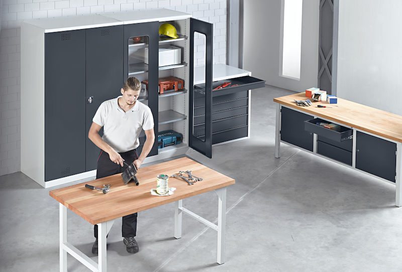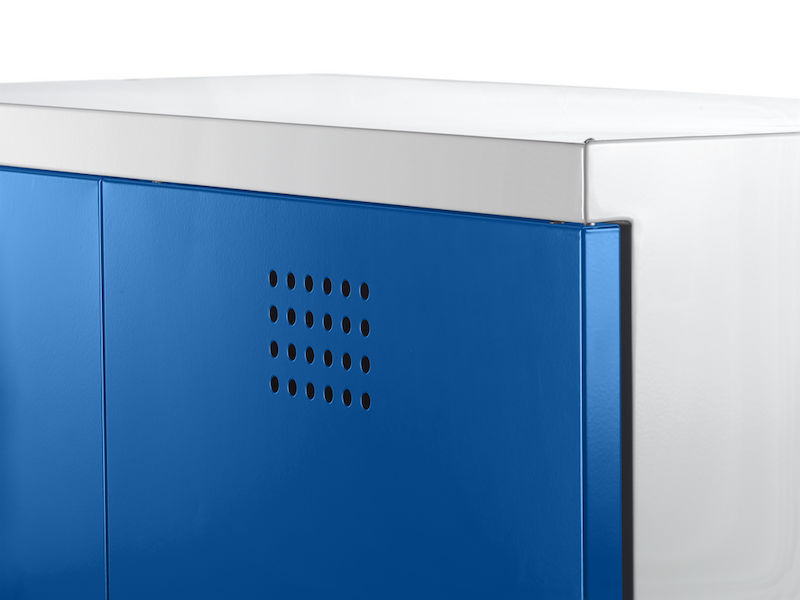 Kemikaalikaappi Tom, 4 valuma-allasta, gentiansiniset ovet. Tukeva hitsattu ja jauhemaalattu teräspeltirakenne. Runko vaaleanharmaa RAL 7035.