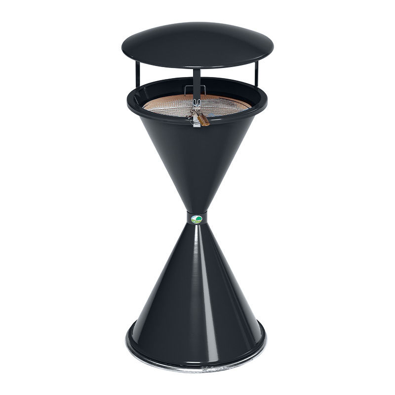 Tuhkakuppi ulkokäyttöön, lattiamalli, katos ja pyörivä maajalusta, antrasiitinharmaa. Sisä- ja ulkokäyttöön. Jauhemaalattua teräspeltiä, Kaksiosainen rakenne. Irrotettava sinkitty ritilä ja hiekkaa säästävä sisäastia. Suositeltu hiekantarve 8 kg/täyttö. Kokonaiskorkeus 965 mm, ø 440 mm. Jalusta Kuumasinkittyä teräspeltiä. Asennusmateriaali pulttikiinnitystä varten sisältyy toimitukseen. Katto Jauhemaalattua teräspeltiä. Tuhkanvärinen. Voidaan varmistaa riippulukolla ja ketjulla (sisältyy).