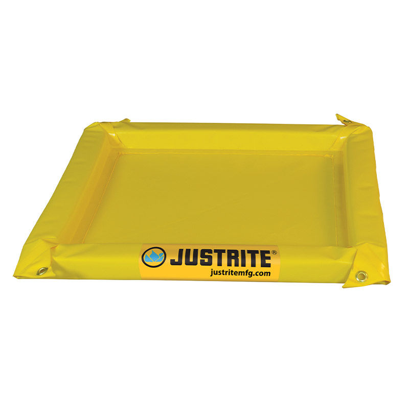 Vuotoallas Justrite, kokoontaittuva, PxLxK 3552x3152x51 mm, 511 L, ei koottu. Taitettava vuotosuoja säiliöiden, pattereiden, likaisten koneen osien ja muiden tarvikkeiden väliaikaiseen säilytykseen ja huoltoon. Sekä sisä- että ulkokäyttöön. Suojaa ja estää kemikaalien ja öljyjen pääsyä viemäreihin. Valmistettu erittäin kestävästä ja UV-suojatusta PVC:stä. Voidaan pestä saippualiuoksella, uudelleenkäytettävä. Sivuseinät vaahtomuovisydämellä, joka suoristaa itsensä, joustaa ja jonka päältä voidaan ajaa. Helposti taitettava kokoon tilan säästämiseksi silloin kuin allasta ei tarvita. Sivuseinät ovat 152 mm leveät.